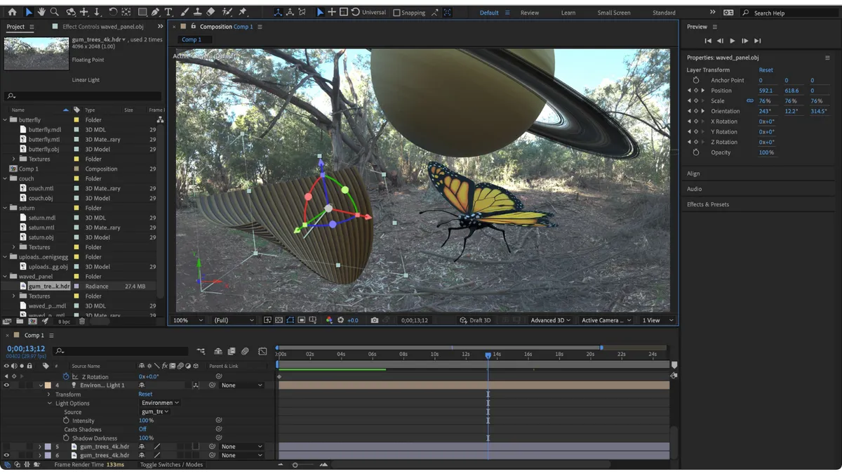 - 3D Animation and Integration: Create and manipulate 3D objects, add effects, and composite 3D scenes within 2D footage.