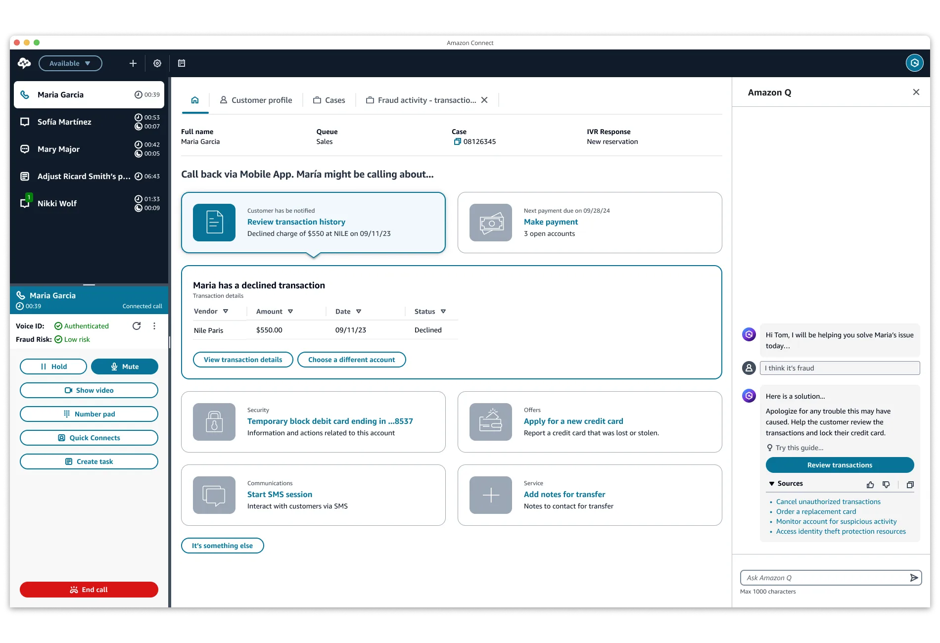 With Amazon Connect agent workspace, agents have a single, unified application for efficiently handling customer needs. When agents accept calls, chats, messages, and tasks, they can view updated customer information, receive generative AI-powered recommendations, manage complex issues, and use step-by-step guidance to resolve issues quickly. The agent workspace delivers these capabilities out-of-the box and also allows you to integrate third-party back-office applications, end-customer portals, and agent reporting dashboards you use today.