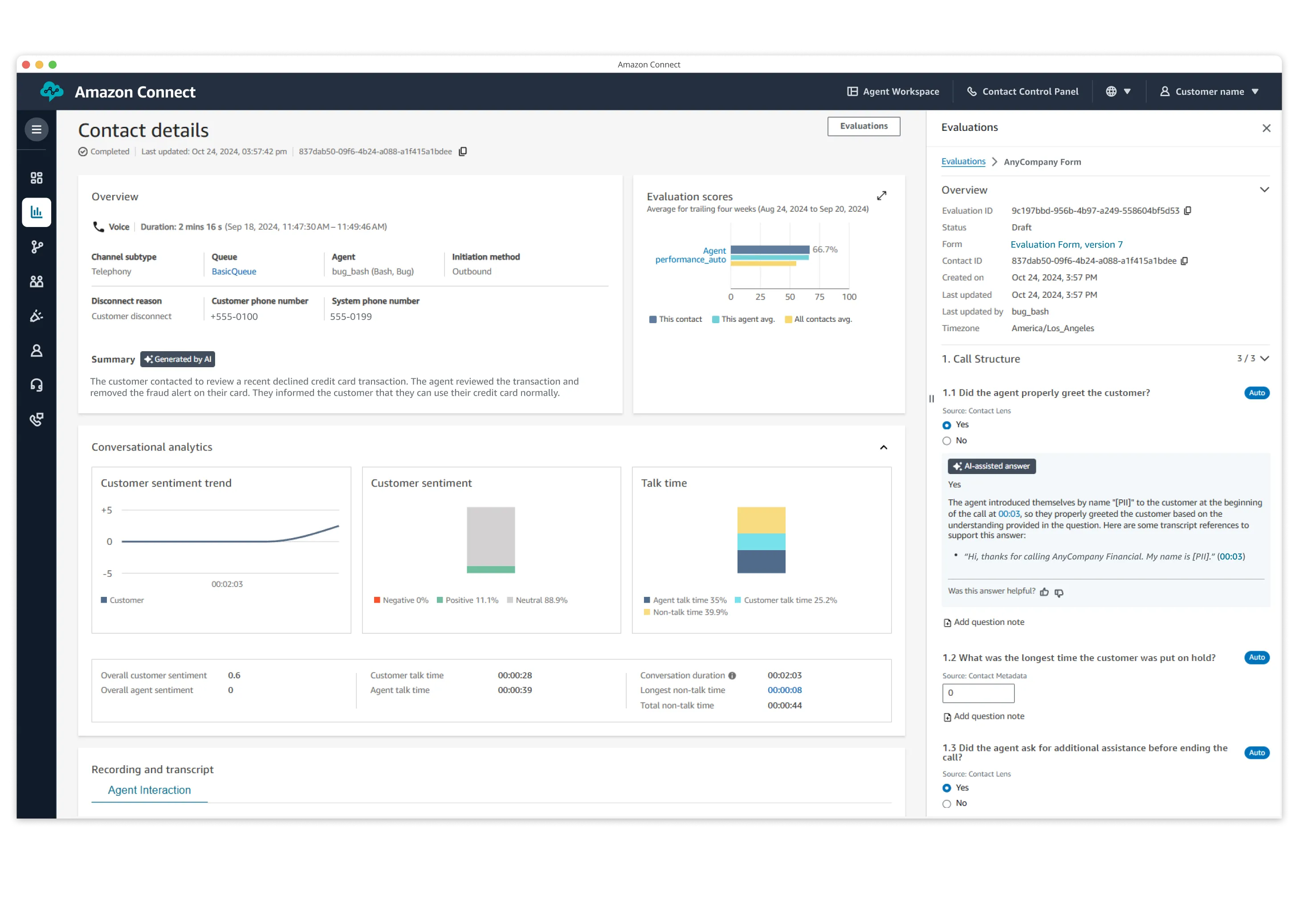 Save valuable time with generative AI-powered post-contact summaries that provide essential information from customer conversations in a structured and easy to read format, without having to read through transcripts or monitor calls. Agents can also use summaries that are generated within seconds after a call ends, significantly reducing After Contact Work (ACW). Additionally, managers can automatically perform and complete agent evaluations with generative AI and get aggregated agent performance to identify coaching opportunities.