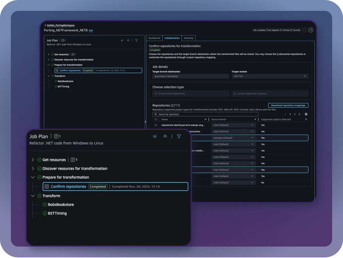 Offload labor-intensive, complex transformation tasks across the discovery, planning, and execution phases to Amazon Q Developer agents with expertise in languages, frameworks, and infrastructure, freeing your teams to innovate.